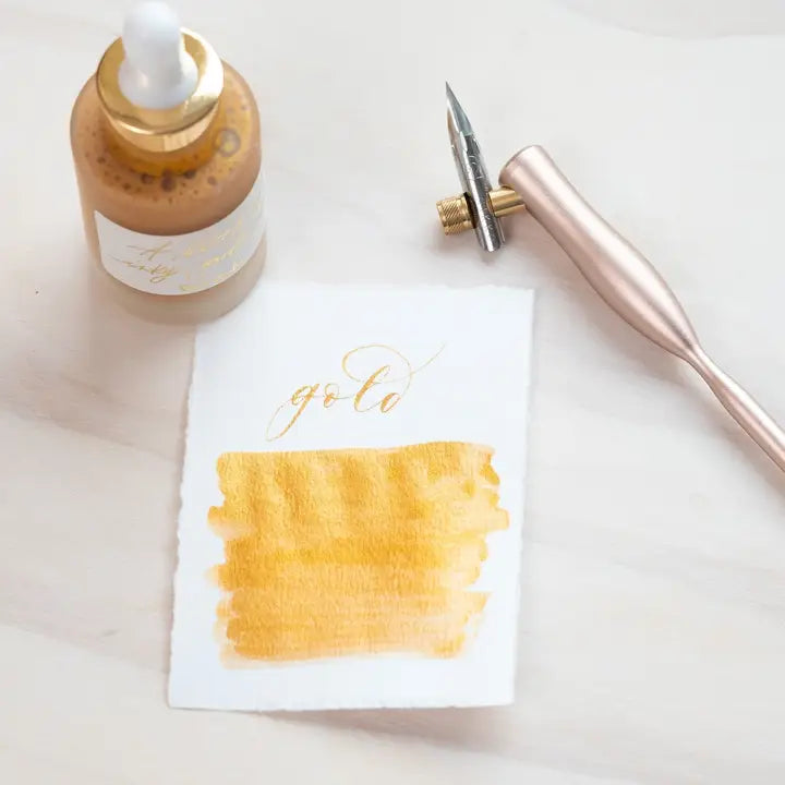The highest-quality acrylic-based calligraphy ink, made in the UK. This metallic beauty needs no introduction! A true touch of class and elegance, this gold ink is the pièce de résistance and an undeniable treasure to have in your calligraphy ink collection.